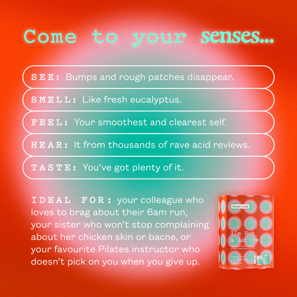 Made with lactic and glycolic acids to gobble up dead skin, help clear body breakouts and hydrate at the same time. Together with hydrating oils and deeply nourishing mango seed butter, I’m a lightweight and non-sticky body lotion for skin that’s softer than a baby’s bum.